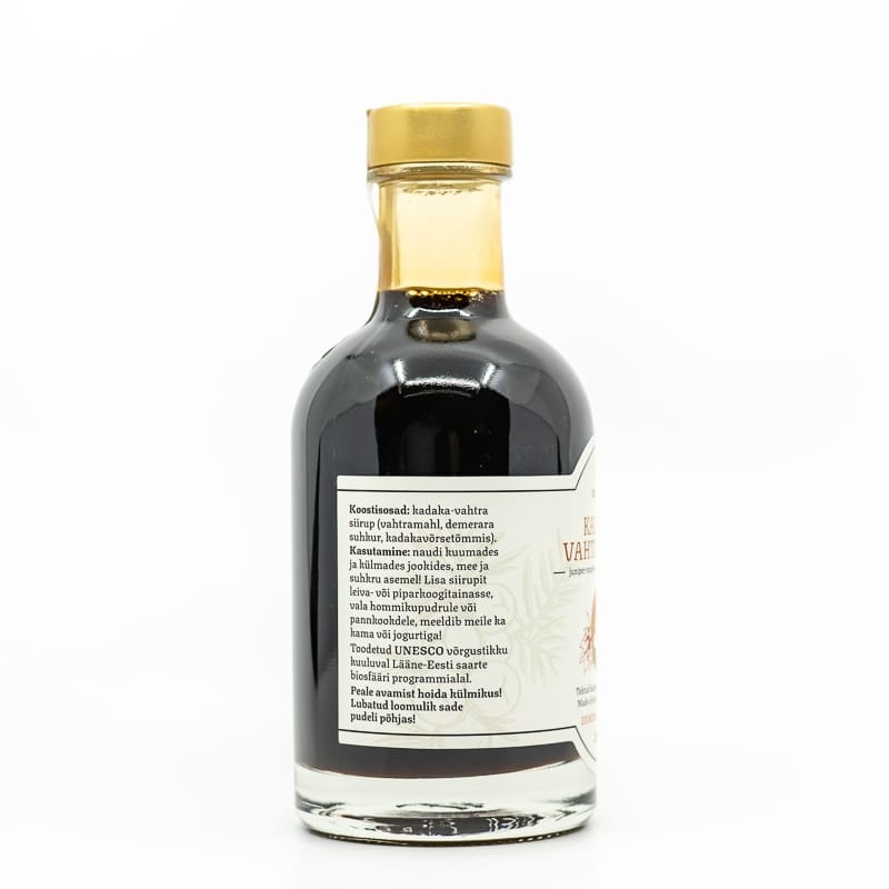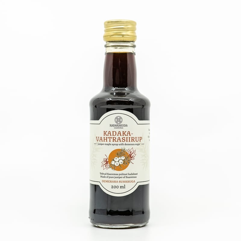 Saaremaa kadakavõrsetest ja vahtramahlast kokku keedetud siirupile annab erilise karamellise maitse kvaliteetne demerara suhkur.