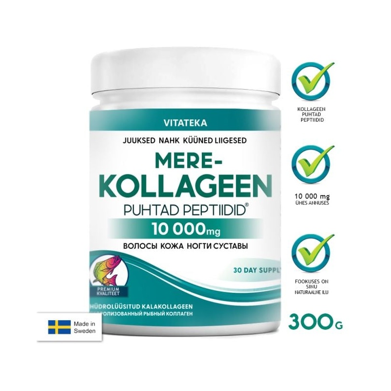 Koostis: puhas hüdrolüüsitud kalakollageen (puhas hüdrolüüsitud merekollageen, milles sisalduvad aminohapped L-glütsiin, L-proliin, L-alaniin, L-hüdroksüproliin, L-glutamiinhape, L-arginiin, L-asparagiinhape, L-seriin, L-lüsiin, L-leutsiin, L-valiin, L-treoniin, L-fenüülalaliin, L-isoleutsiin, L-hüdroksülüsiin, L-metioniin, L-histidiin , L-türosiin, L-tsüsteiin .