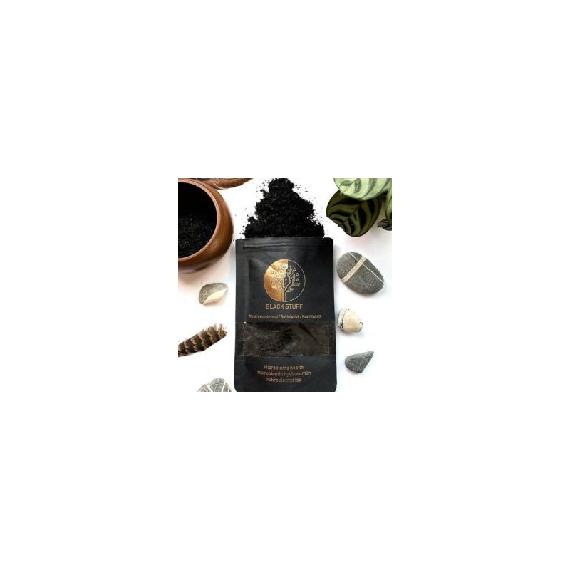 Black Stuff ühendab endas loodusliku päritoluga bioaktiivsete ühendite täisspektrit – sealhulgas fulvohappeid, ligniini ja polüfenoole –, mis on saadud männikoorest ning mustast pässikust. Need ühendid on seedimise seisukohast olulise mikrobioomi elutegevuse üks osa: terviklik mikroobide ökosüsteem mõjutab meie enesetunnet mitmel moel alates kõhust kuni mõtlemiseni.